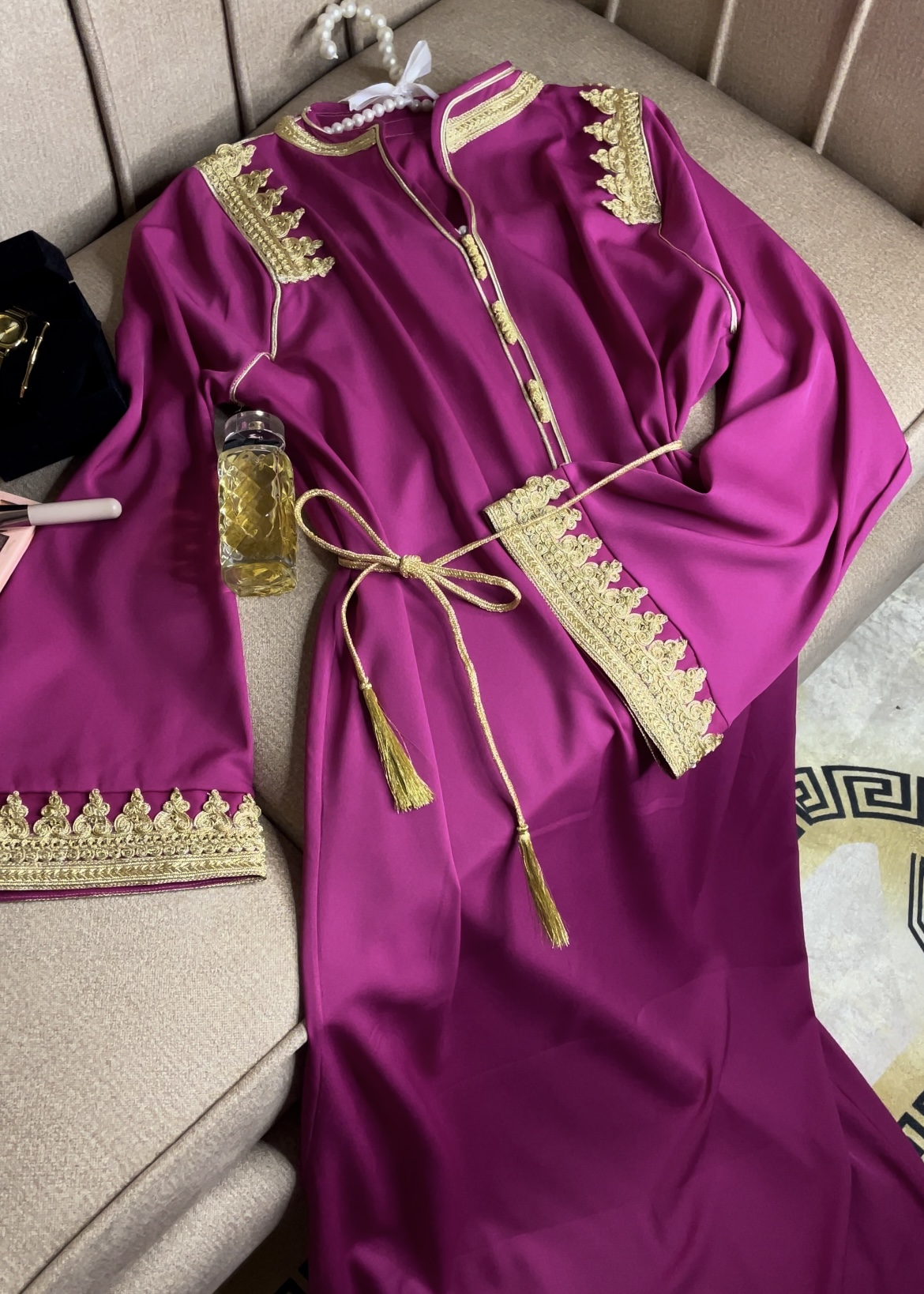 A pink caftan dress with gold details.