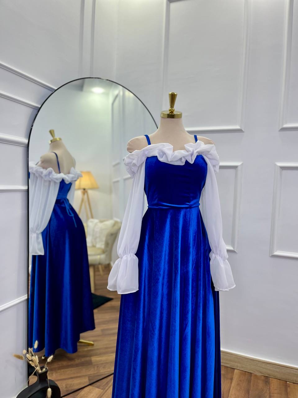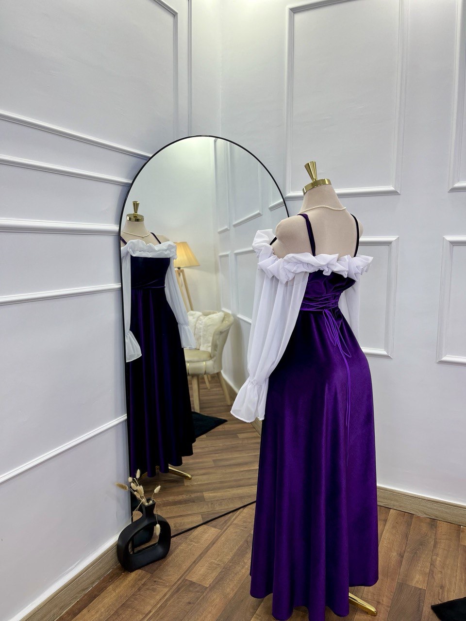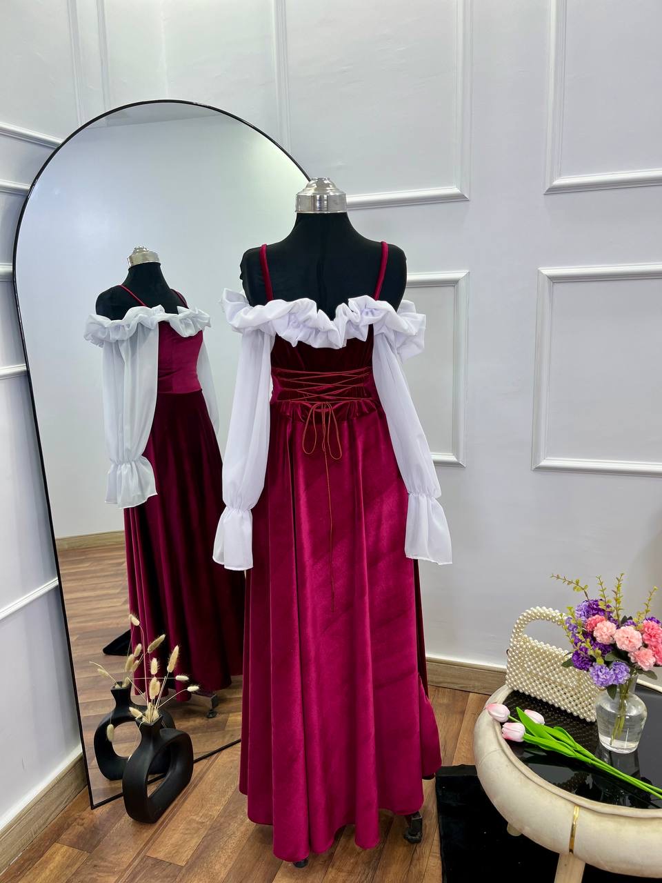 A velvety dress with white chiffon sleeves and adjustable size.