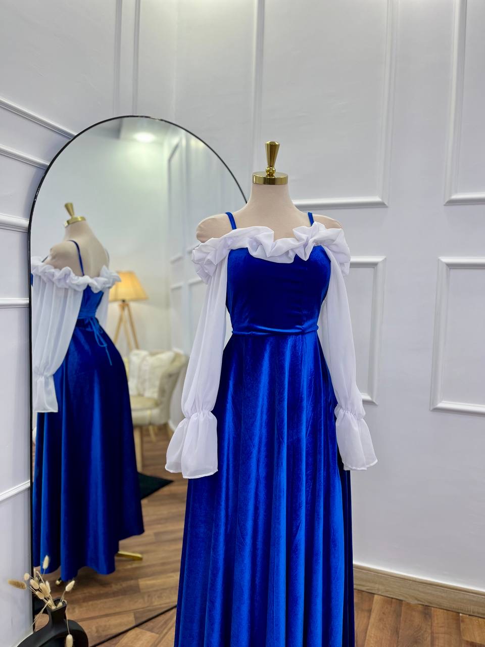A velvety dress with white chiffon sleeves and adjustable size.